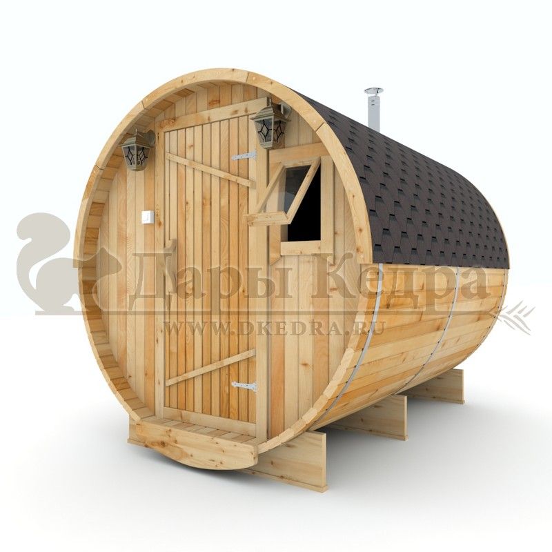 Баня-бочка круглая из кедра 4 метра Это изделие круглой вытянутой формы с двумя отделениями: раздевалкой и парной. Лавочки из кедра находятся по всей длине бани-бочки с обеих сторон. Печь расположена в парилке около дальней стены. Для удобства пользования в раздевалке установлена вешалка и полочка из кедра. За счет небольшой конструкции баня нагревается не более 30 минут. По вашему желанию баню-бочку можно дополнить печью с внешней загрузкой, благодаря которой весь мусор после топки останется на улице. Круглая баня-бочка не требует полноценный фундамент, поэтому при необходимости ее можно перенести в другое место. Обращаем Ваше внимание, что в стандартную комплектацию бани входят лавки в парной с обеих сторон. Дополнительно можно заказать полок открытого или закрытого типа! Кедр обладает ароматическими свойствами. Он не деформируется и влагоустойчив, при правильном уходе за деревом на нем не развиваются грибки и плесень.