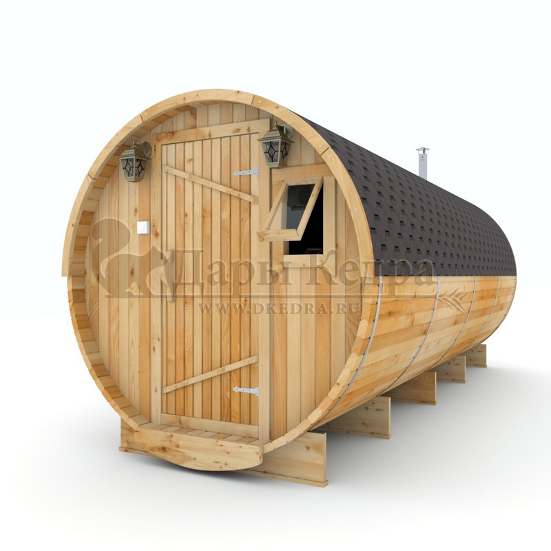 Баня-бочка круглая из кедра с боковым входом (все размеры) Боковой вход у такой модели находится в начале или в середине конструкции. В увеличенные модели можно повесить полочки и вешалки из кедра. Время растопки такой бани не превышает 30 минут. По вашему желанию баню-бочку можно дополнить печью с внешней загрузкой, благодаря которой весь мусор после топки останется на улице. Круглая баня-бочка не требует полноценный фундамент, поэтому при необходимости ее можно перенести в другое место. Обращаем Ваше внимание, что в стандартную комплектацию бани входят лавки в парной с обеих сторон. Дополнительно можно заказать полок открытого или закрытого типа! Кедр обладает ароматическими свойствами. Он не деформируется и влагоустойчив, при правильном уходе за деревом на нем не развиваются грибки и плесень.