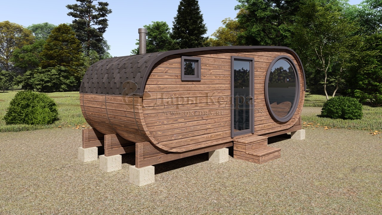 Баня-бочка представляет собой конструкцию в виде бочонка без углов. Такая форма считается оптимальной для равномерного распределения пара по всей внутренней поверхности парной. Таким образом, пар не скапливается в одном месте, а циркулирует по всему объему. Соответственно, круглая (квадратная, овальная) баня экономичная: топится быстро, требует дров мало.