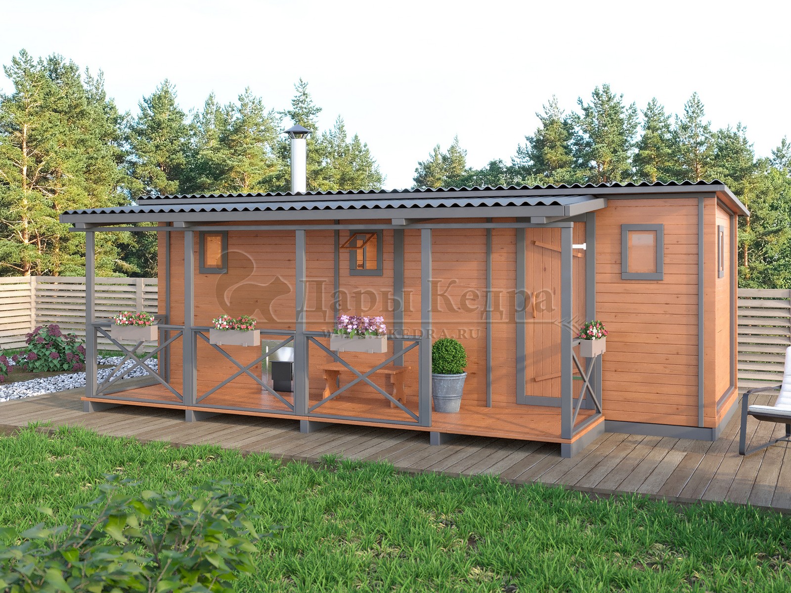 Это классическая прямоугольная модель бани с тремя отделениями: предбанником, моечной и парилкой. Для удобства пользования предбанник оснащен лавочкой и вешалкой. В моечной находится лавка и полочка из кедра. Парилка оборудована двухуровневым открытым полком и печью. Время растопки такой бани не превышает 30 минут. На просторной веранде можно оставить вещи или отдохнуть после парения. Каркасно-щитовую баню можно заказать как в готовом, так и в разборном варианте. В разборной модели готовые щиты из кедра быстро собираются в полноценное строение, что также позволяет исключить лишний строительный мусор. Такая баня не требует полноценный фундамент, поэтому при необходимости ее можно перенести в другое место.