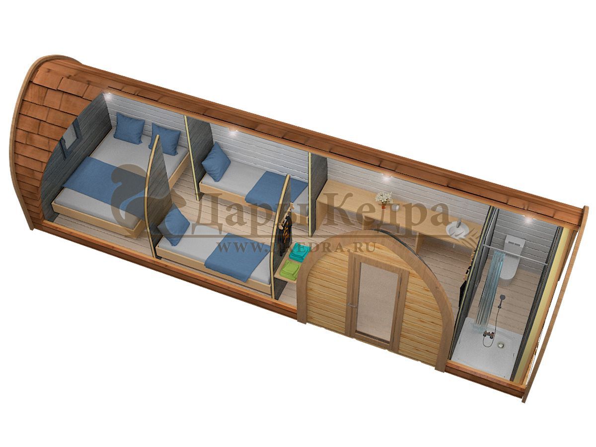 • Кемпинг дом «Дуэт+» с боковым входом Такой кемпинг дом удобное и практичное решение для дачного использования или обустройства загородных баз отдыха. Увеличенные размеры и боковой вход со стеклянной дверью позволяют зонировать внутреннее пространство помещения. Домик включает в себя: Жилую зону с кроватями, столиком, вешалкой и полкой; Санузел с сантехникой, душевой поддоном и душевую стойку; Кемпинг дом изготовлен из хвойных пород древесины. Кровля из мягкой черепицы обеспечивают защиту от осадков.