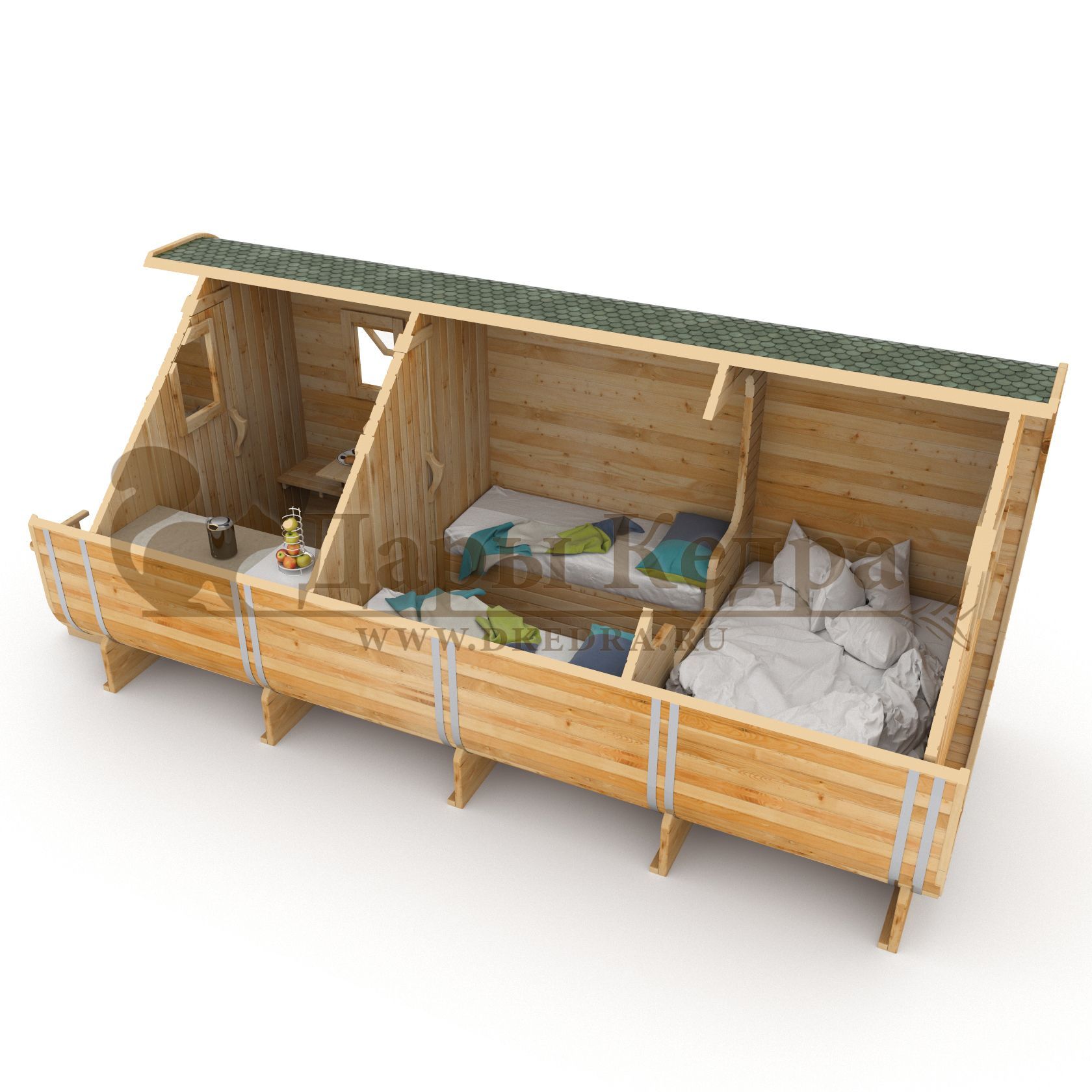 • Кемпинг садовый домик «Дружный» Домик с тремя помещениями подходит для дачного использования в теплое время года или обустройства загородных баз отдыха. Прихожая и кухня занимают одну комнату, в которой стоит стол из кедра. Две другие оборудованы четырьмя деревянными лежаками, по желанию их можно заменить на двуспальные кровати. Либо обустроить санузлом и душевой зоной. Для удобства пользования кемпинг дом можно укомплектовать верандой с лавочками или козырьком.