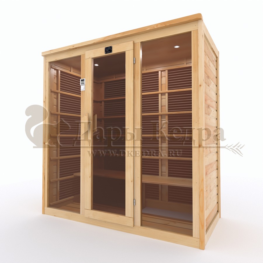 Четырёхместная инфракрасная сауна кабина из кедра с карбоновыми излучателями Это специально оборудованная кедровая кабина для прогрева тела человека сухим теплом. Воздух в таких парных не нагревается. Инфракрасные лучи воздействуют на тело, равномерно прогревая мышцы, суставы и органы. Карбоновые излучатели, встроенные в стены кабины, обладают мягким прогревом, что полностью исключает возможность ожога. Работает кабина за счет электричества. Инфракрасная сауна с карбоновыми излучателями подойдет как для домашнего использования, так и для коммерции. Обращаем Ваше внимание, что в стандартную комплектацию входит трапик для ног, но вы можете его заменить на цельный пол совершенно бесплатно! Целебная древесина кедра и инфракрасные лучи благотворно влияют на организм человека в целом. При регулярном использовании инфракрасной сауны укрепляется иммунитет, улучшается кровообращение и состояние кожи, выводятся токсины.